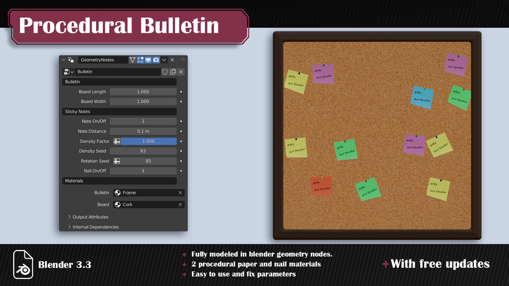 The product contains three geometry node generators with six colors of Paper, and you can create unlimited Bulletins. More options will be added hopefully in the future with free updates.