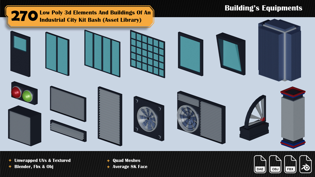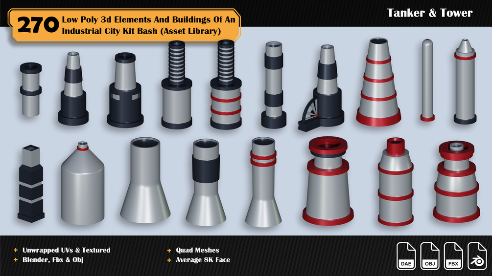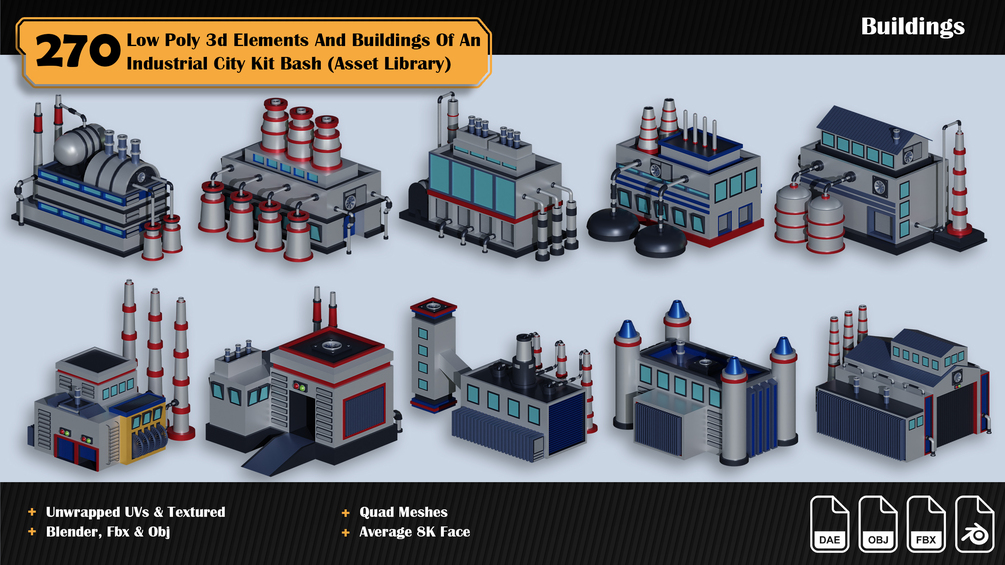 270 3d Elements And Buildings Of An Industrial City Asset Library ( Low Poly Kit Bash )